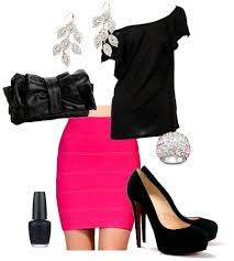 A saia de coz alto rosa escuro arrasa com as outras peças em preto e prata. A blusa de coz alto preta é linda e pode ser usada por dentro com uma alça de sutiã rosa ou por fora com um cintinho rosa. A clutch preta com um toque é mais casual e combina com as joias em prata e glitter. O esmalte preto pode ser trocado por um esmalte vermelho, ou qualquer outra cor e o salto é lindo.